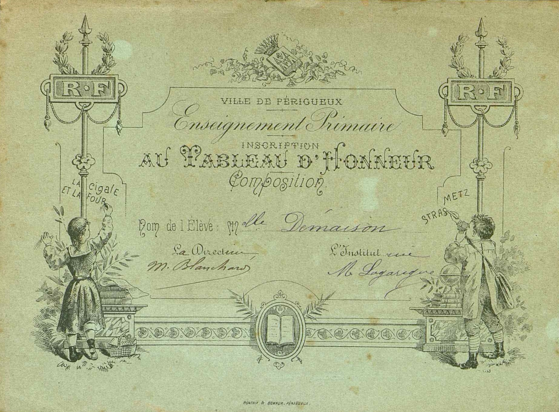 Inscription au tableau d'honneur. Composition. Nom de l'élève Mlle Démaison