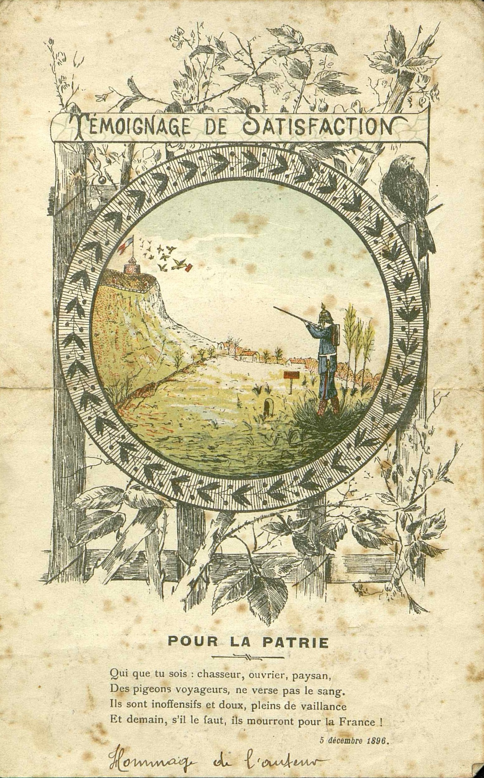 - Document illustré. Poésie sur le thème du pigeon de transmission en période de guerre. Note manuscrite "Hommage de l'auteur". Illustration en médaillon d'un soldat prussien visant un envol de pigeons messagers depuis un fort français. Verso : calculs manuscrits.