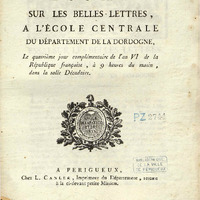 Essai sur les belles-lettres, à l’École centrale du département de la Dordogne, le quatrième jour complémentaire de l'an VI de la République française, à 9 heures du matin, dans la salle Décadaire