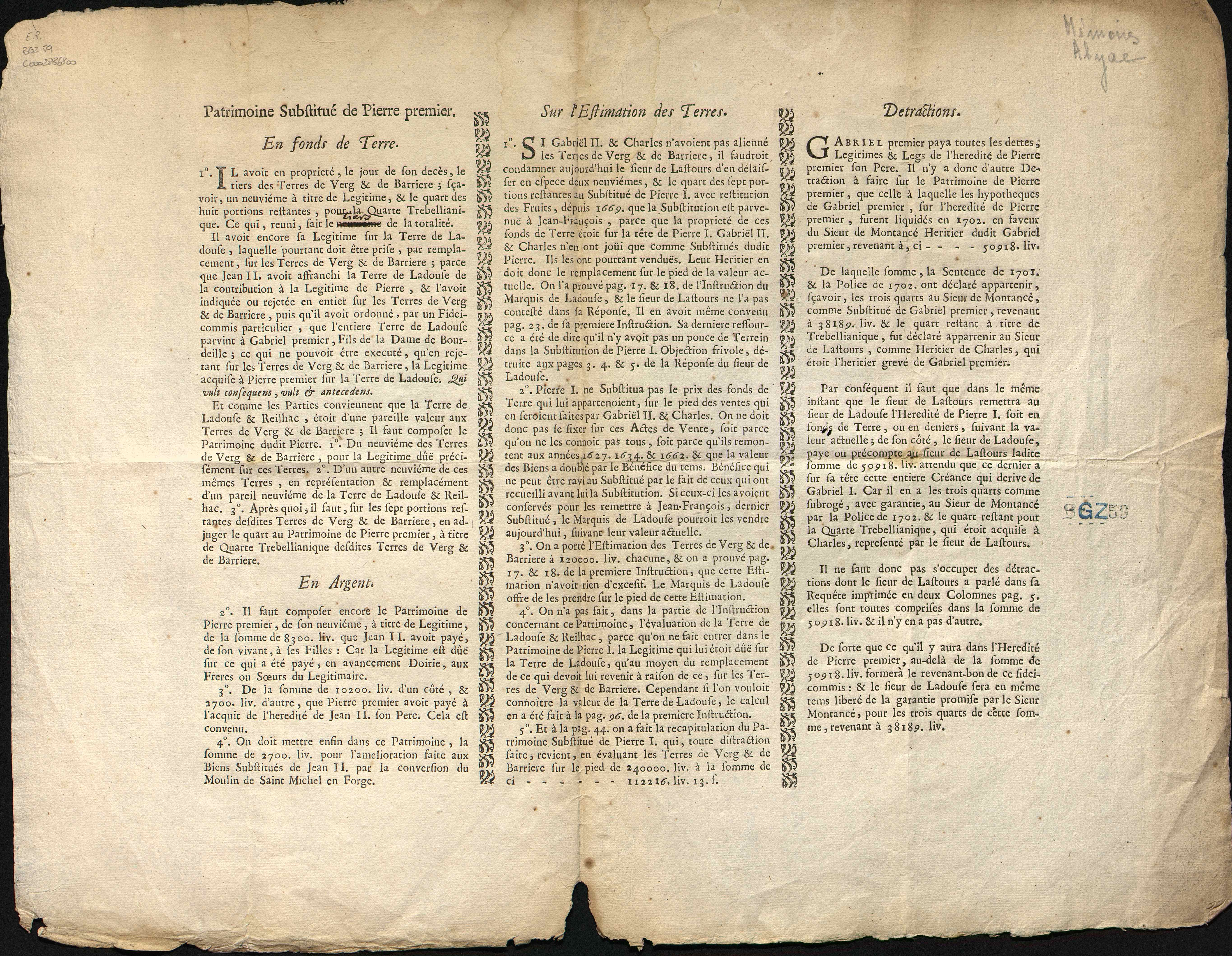 - Patrimoine substitué de Pierre premier. En fonds de terre. En argent. Sur l'estimation des terres. Détractions