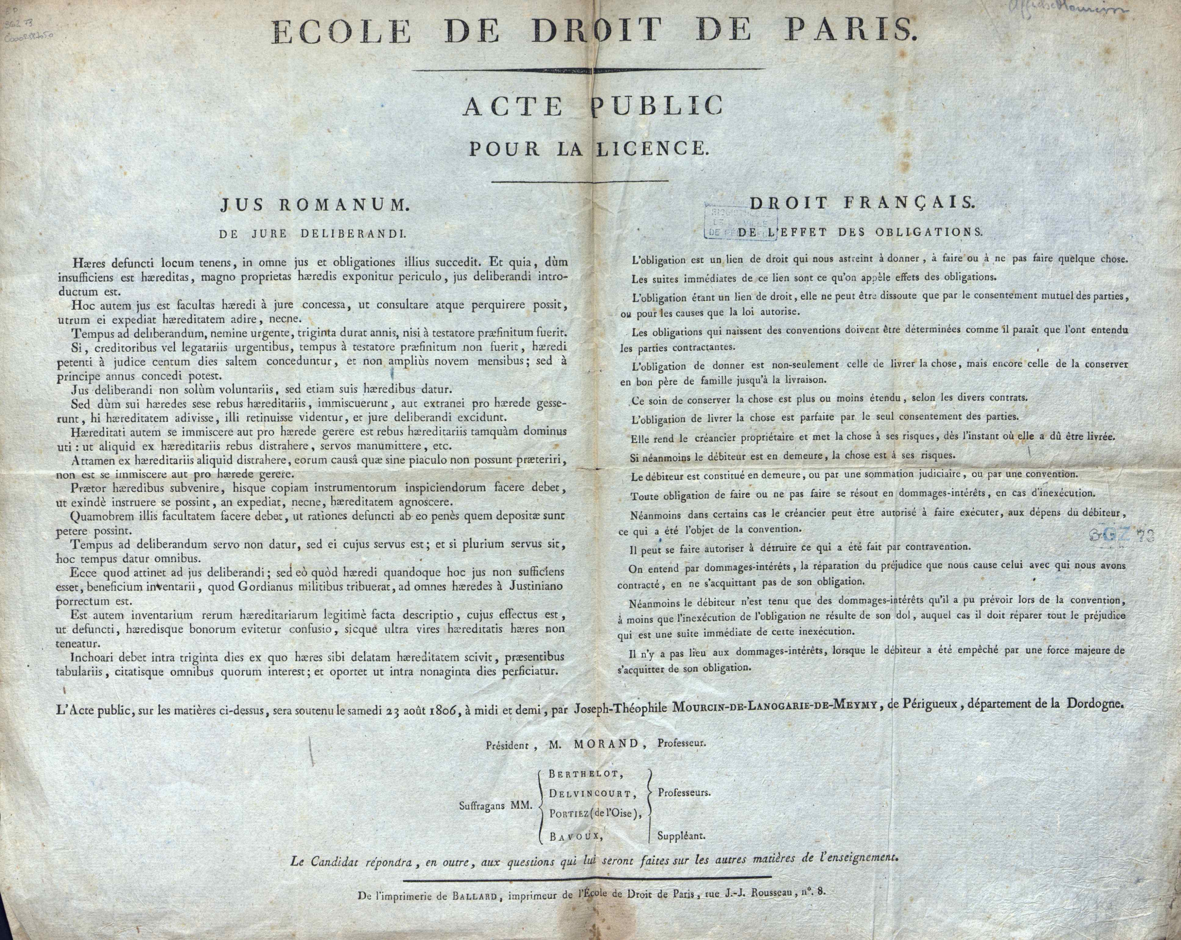 - Ecole de Droit de Paris. Acte public pour la licence [soutenu par Joseph-Théophile Mourcin-de-Lanogarie-de-Meymy]