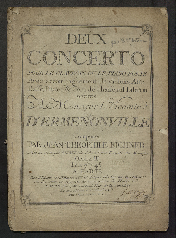 Deux concerto pour le clavecin ou le piano forte avec accompagnement de violons alto, basso flutes et cors de chasse ad libitum dédiés à M. le Vicomte d'Ermenonville composés par Jean Théophile Fichner.