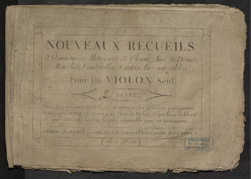 Nouveaux recueils d'ouvertures, morceaux de chants, airs de dance, marches, vaudevilles, et autres airs agréables pour un violon seul.