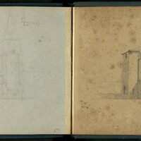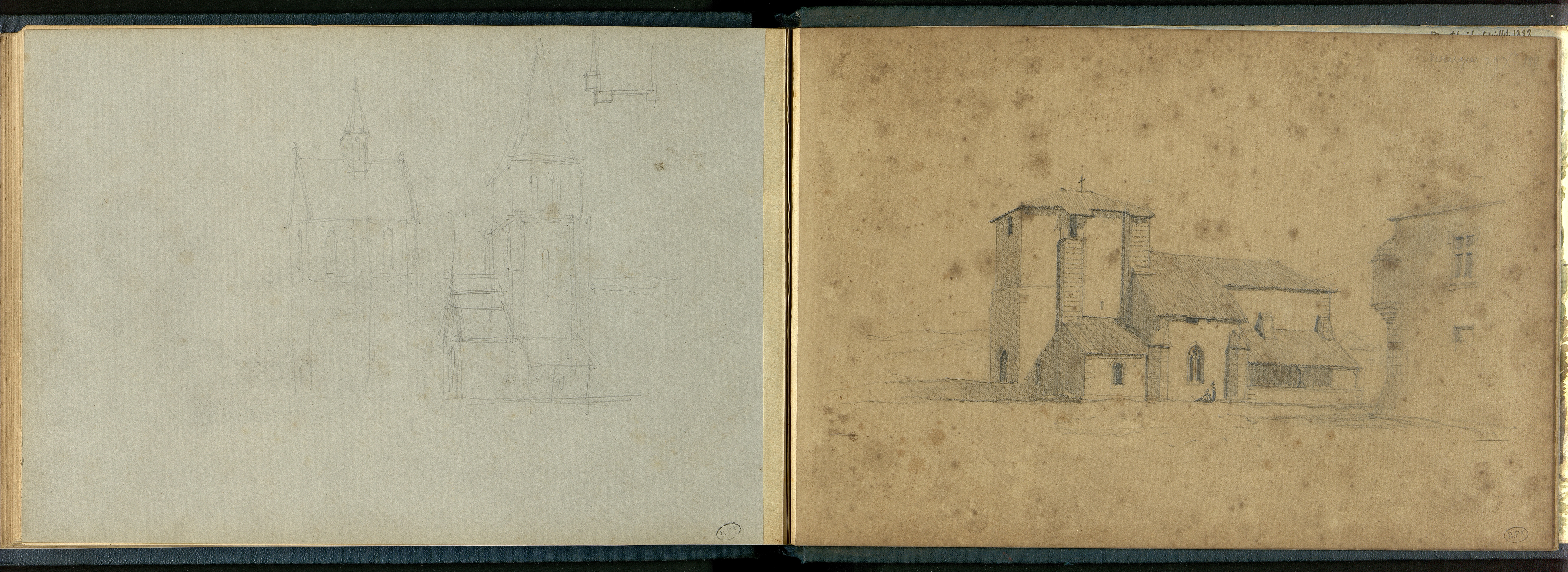 L'église et le château. Page précédente esquisse d'un clocher à flèche de centre de toiture, porche et clocher et section de contrefort d'angle.