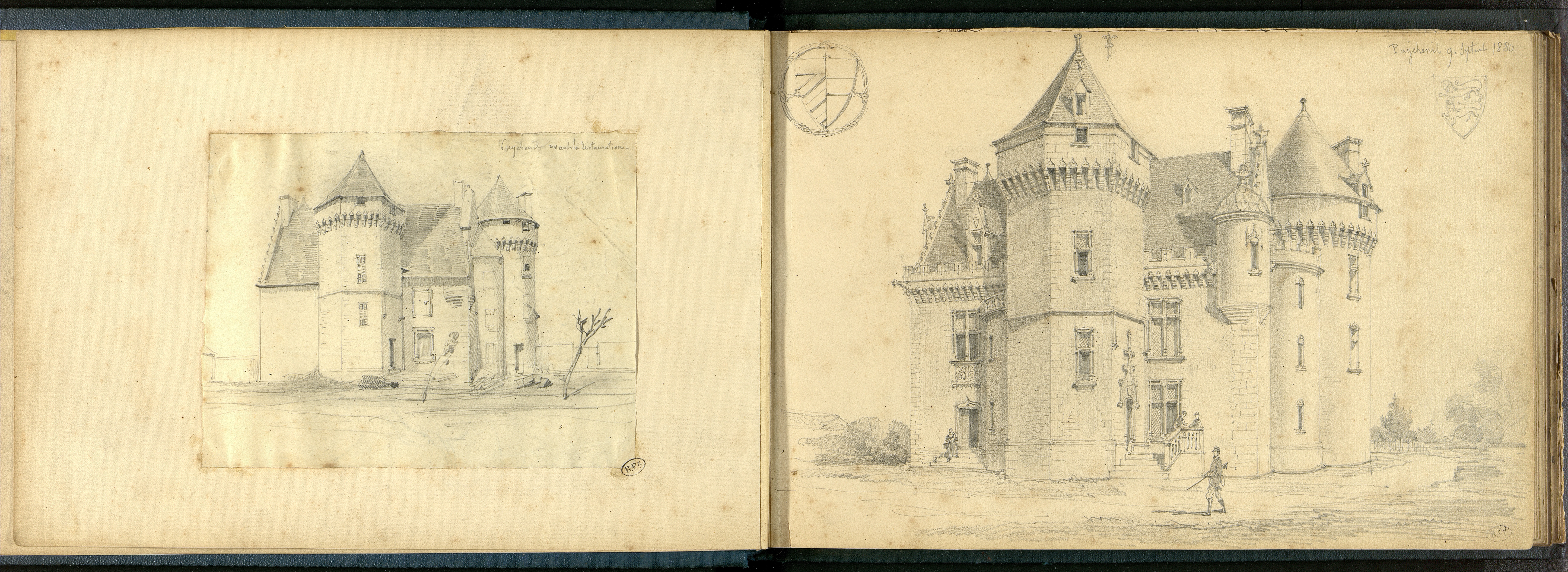Le château après sa restauration avec divers personnages et blasons ; page précédente, le château avant sa restauration.