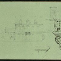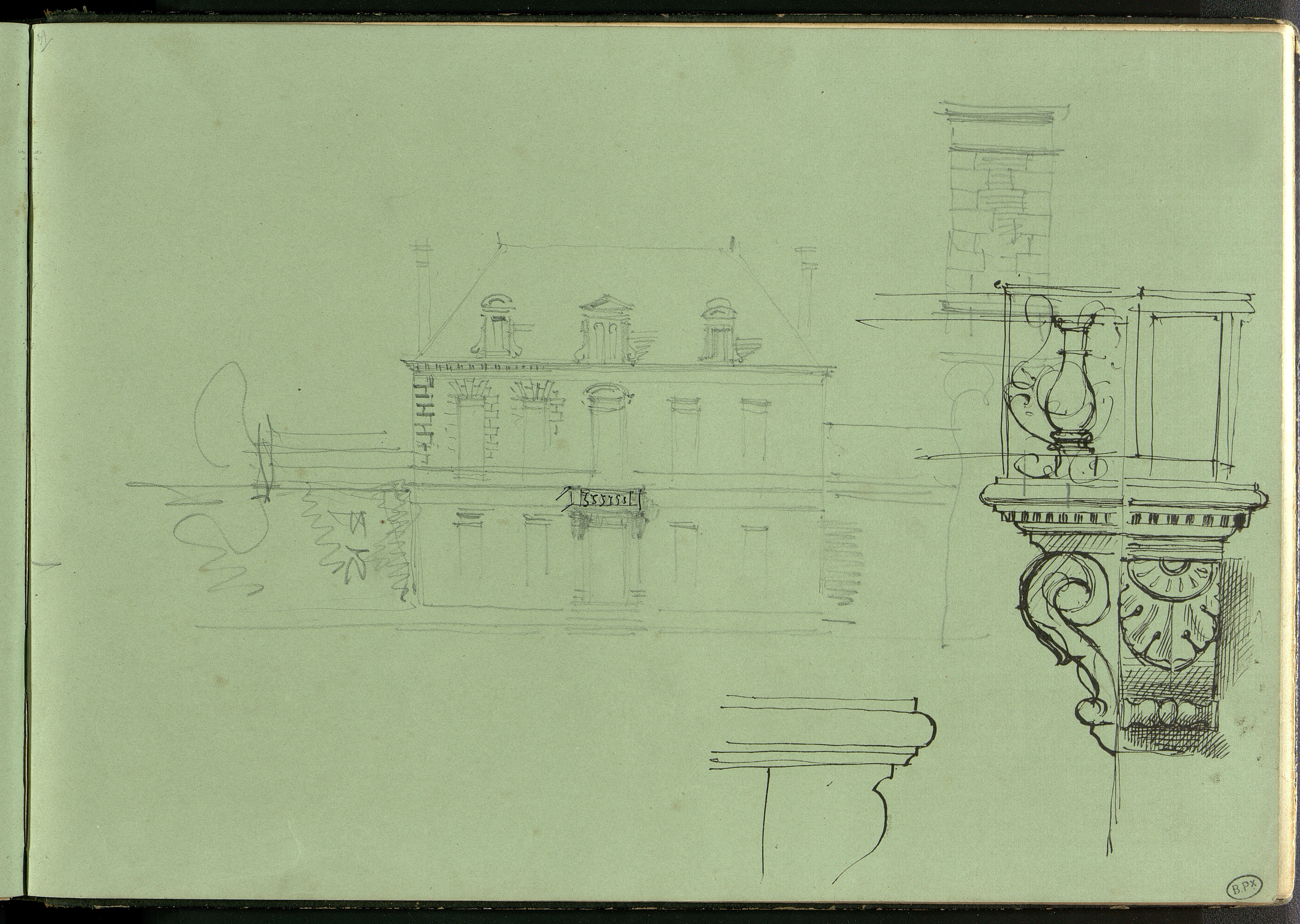 Une maison avec en surimpression un dessin à l'encre d'un balcon.