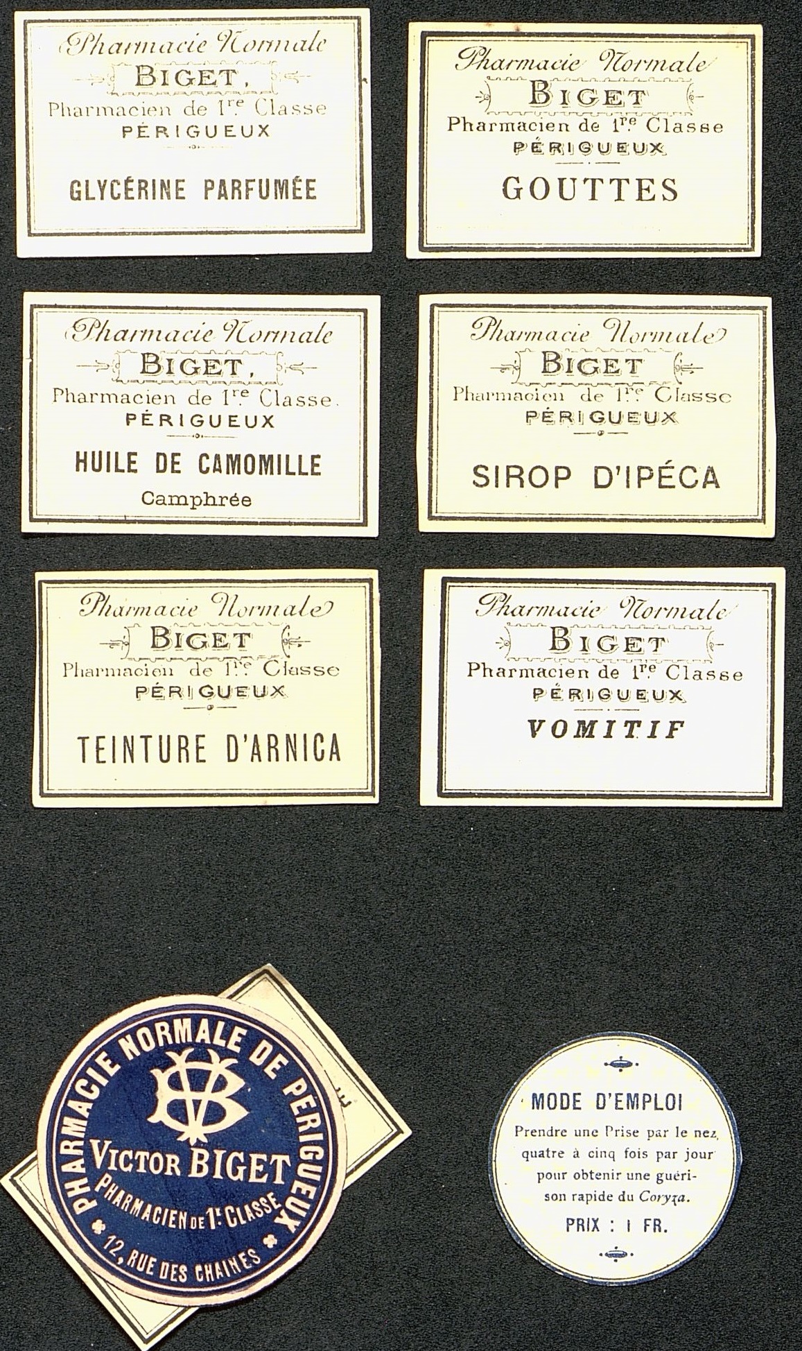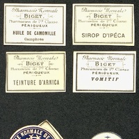 Glycérine parfumée. Gouttes. Huile de camomille camphrée. Sirop d'ipéca. Teinture d'arnica. Vomitif. Macaron de publicité et de posologie.