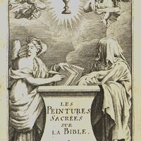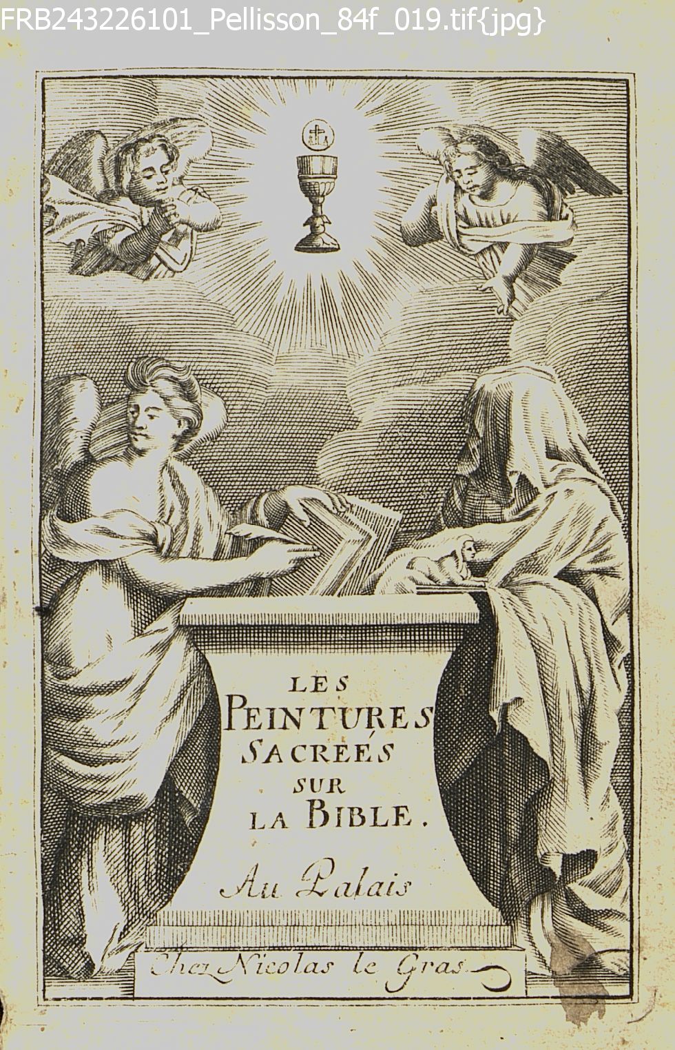 Illustration : Sur un autel à l'antique un ange à senestre tenant une plume écrit sur un codex en détournant le regard, en pendant, s'appuie un personnage entièrement voilé avec sur son bras un petit sphinx. Scène enrichie du saint calice en mandorle rayonnante entouré de deux anges en buste sortant des nuées.