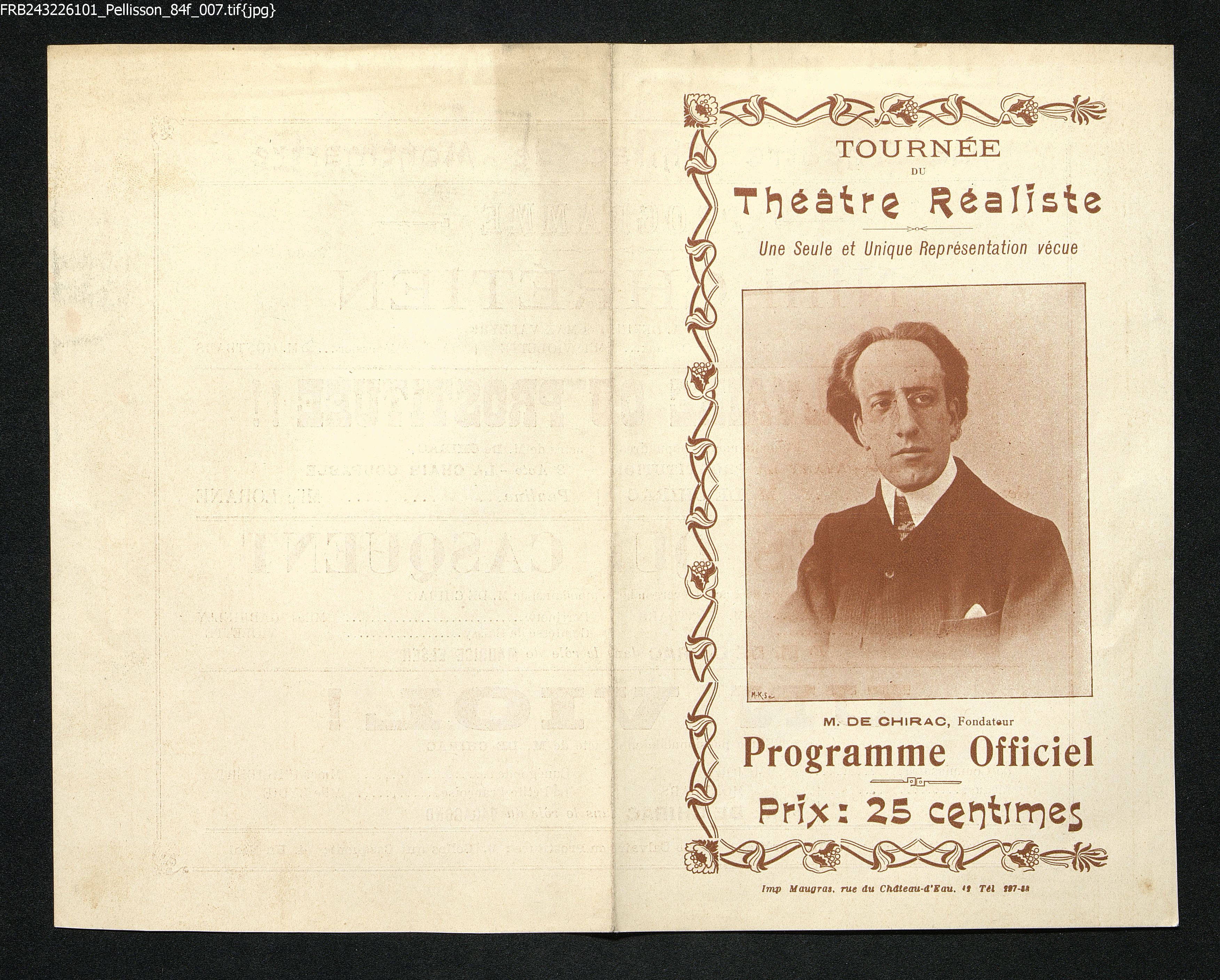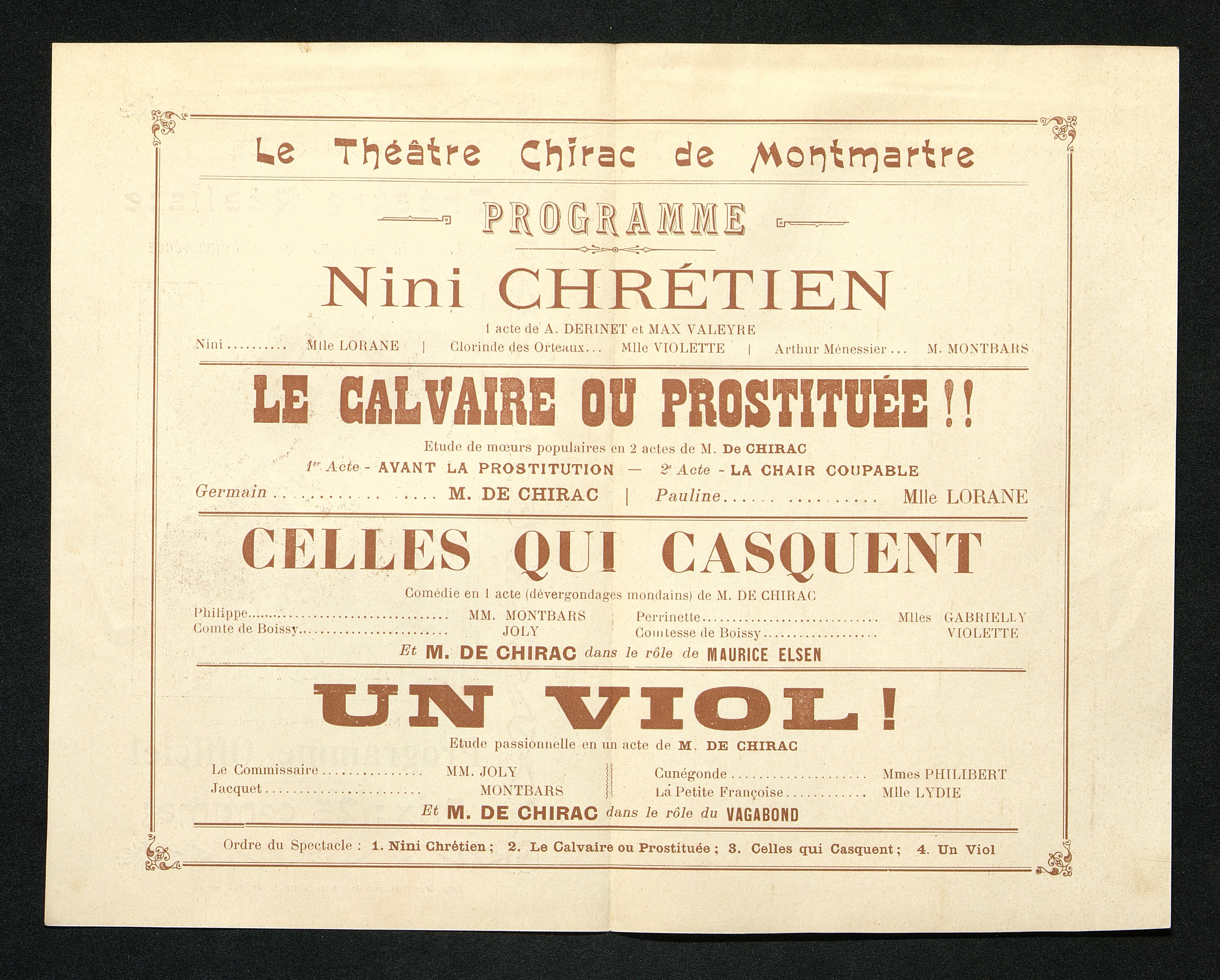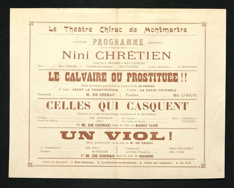 Programme : Nini Chrétien : un acte / A. Derinet ; Max Valeyre, aut. Le Calvaire d'une prostituée : étude de mœurs populaire en deux actes de M. de Chirac. Celles qui casquent : comédie en un acte (dévergondage mondain) de M de Chirac. Un viol : étude passionnelle en un acte de M. de Chirac.