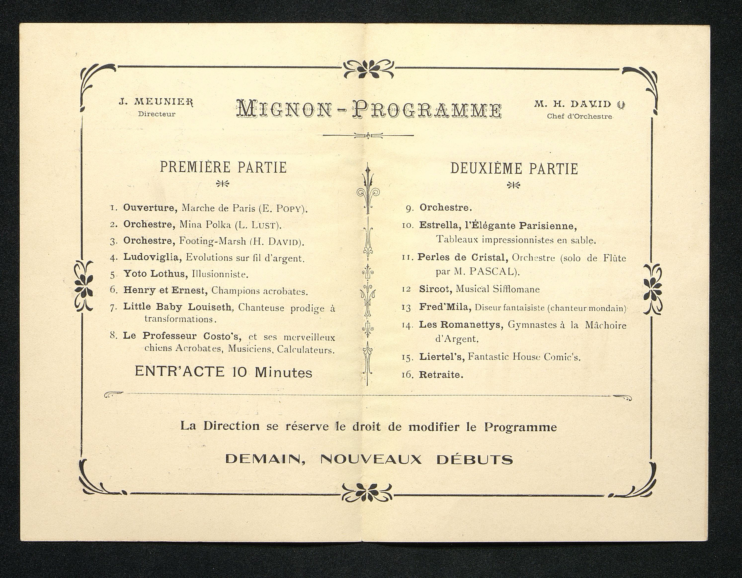 Programme : Première partie : Ouverture, Marche de Paris / E. Popy(sic). Mina Polka / L. Lust ; Orchestre. Footing-Marsh/ H. David ; Orchestre. Illusionniste / Yoto Lothus. Champions acrobates / Henry et Ernest. Chanteuse prodige à transformations. Merveilleux chiens acrobates / Le Professeur Costo's . Entr'acte. Deuxième partie : Orchestre. Tableaux impressionnistes en sables / Estrella. Perles de Cristal / M. Pascal. Musical Sifflomane / Sircot. Diseuse fantaisite : chanteur mondain / Fred' Mila. Gymnastes à la mâchoire d'argent / Les Romanettys. Fantastic House Commic's. Retraite.