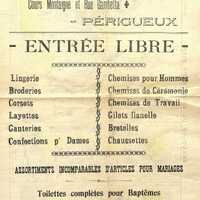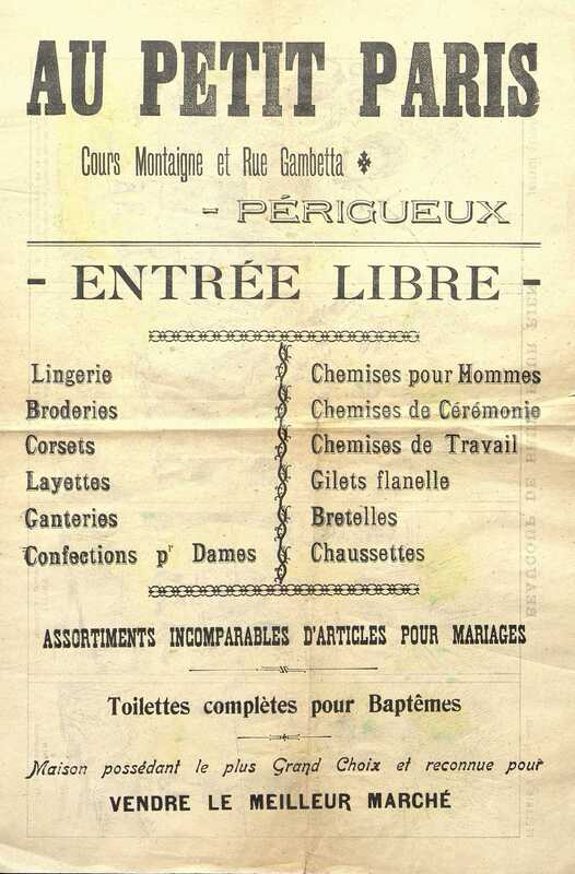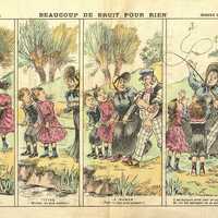 Feuille publicitaire pour des magasins d'habillement à Périgueux, avec au dos une série de dessins humoristiques en images d'Epinal. " Beaucoup de bruit pour rien".