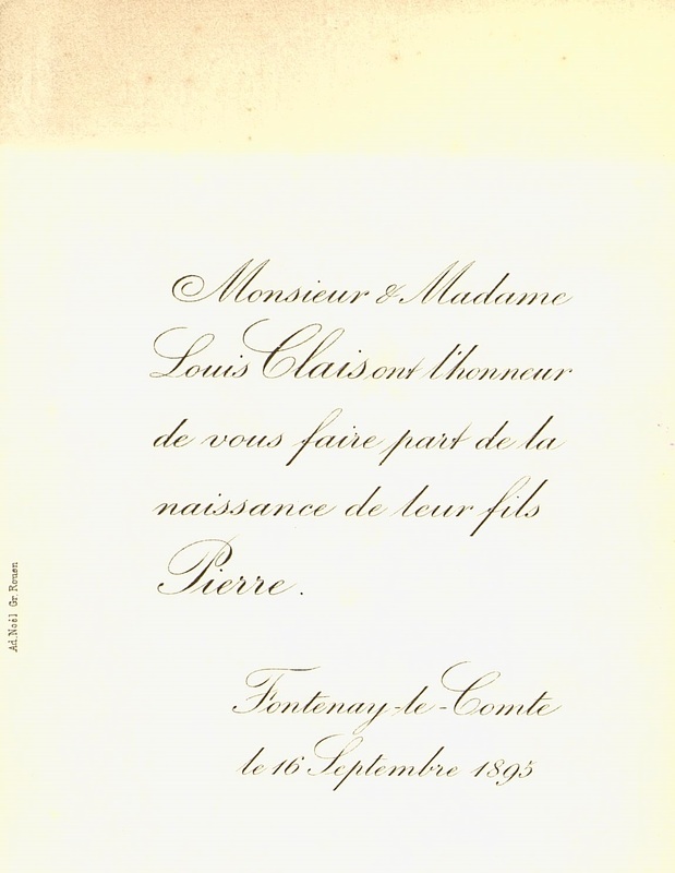 Faire-part de naissance de Pierre Clais.