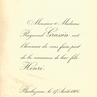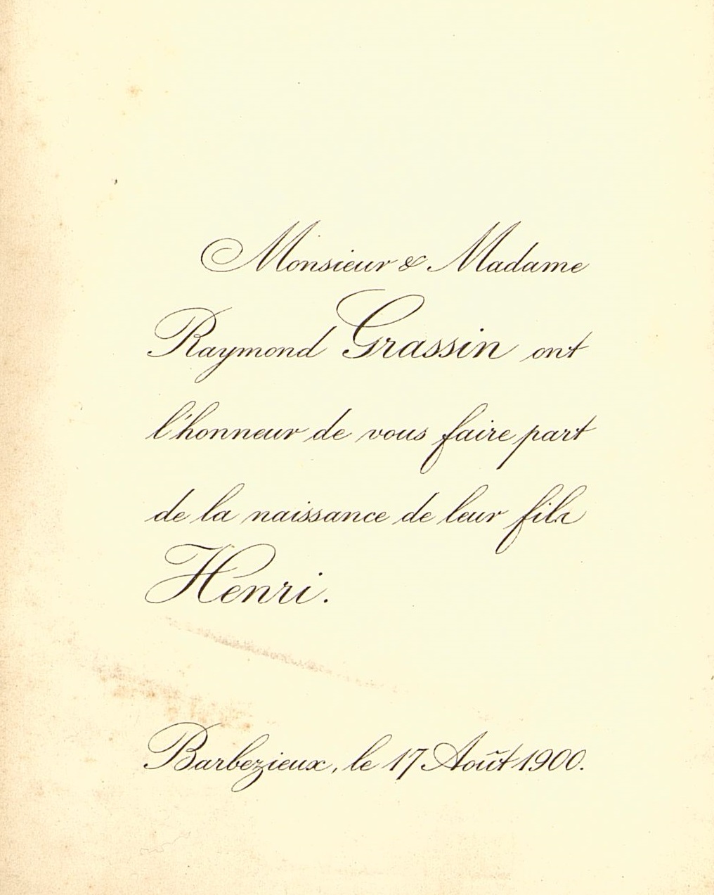 Faire-part de naissance d'Henri Grassin à Barbezieux.