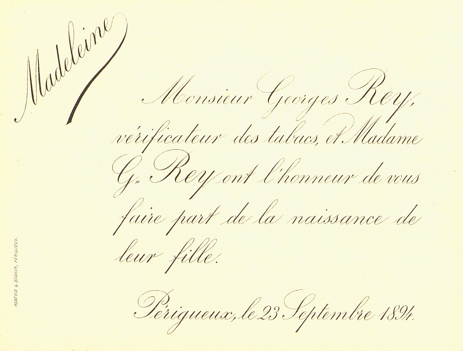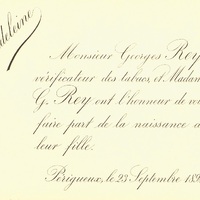 Faire-part de naissance de Madeleine Rey.