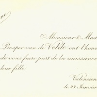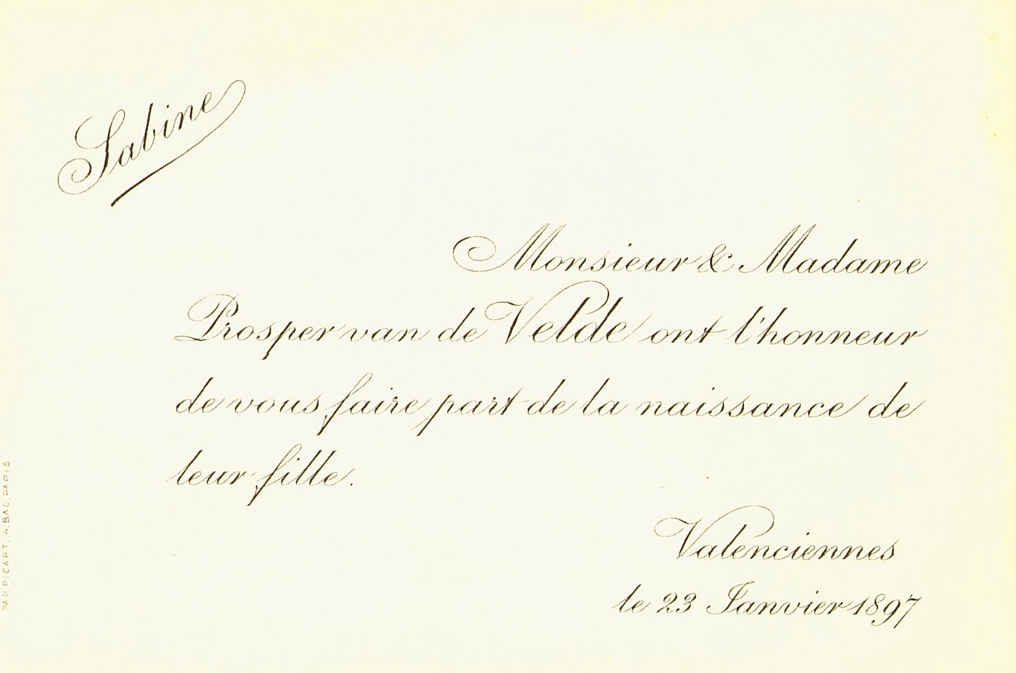 Faire-part de naissance de Sabine van de Velde.