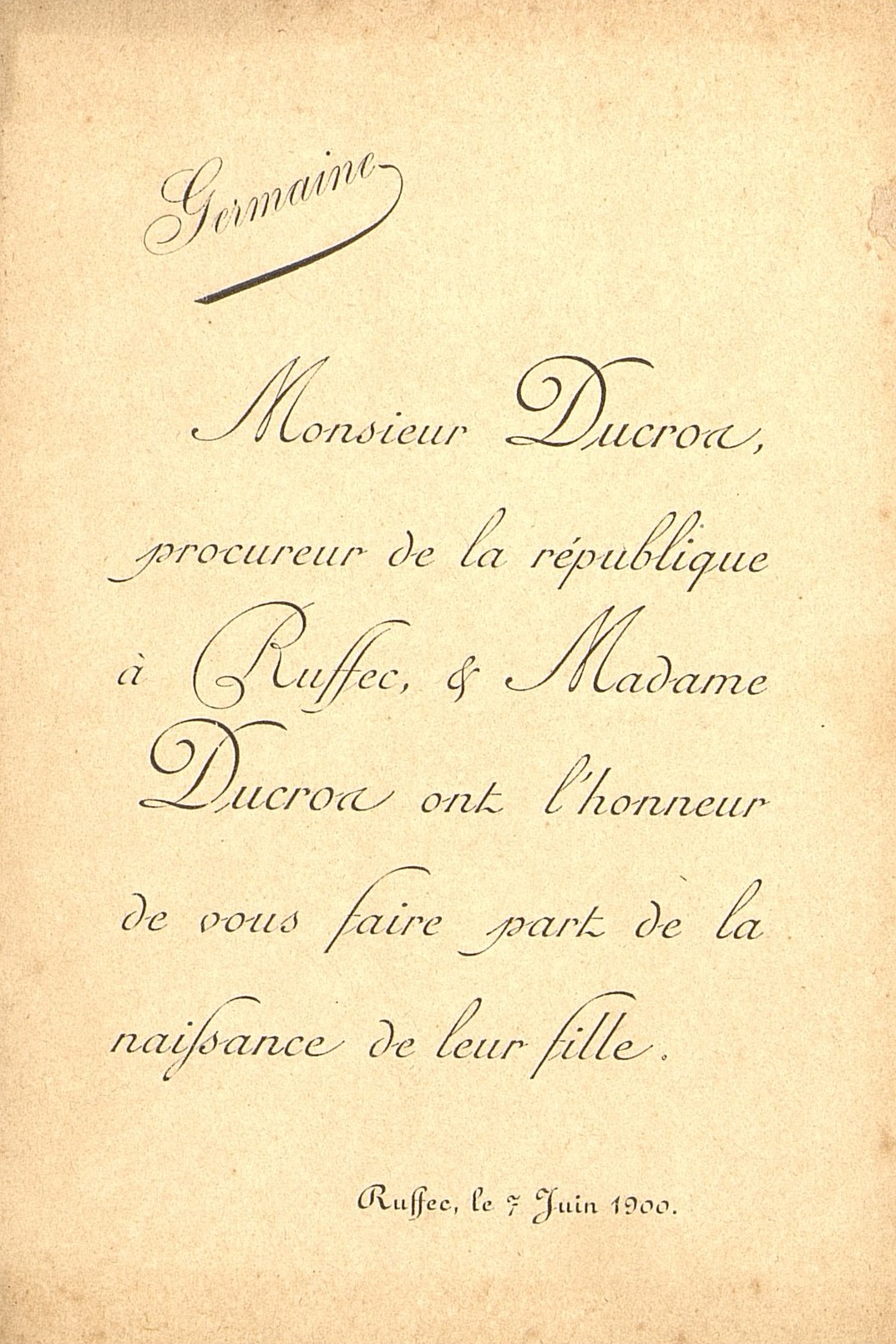 Faire-part de naissance de Germaine Ducros, à Ruffec