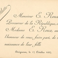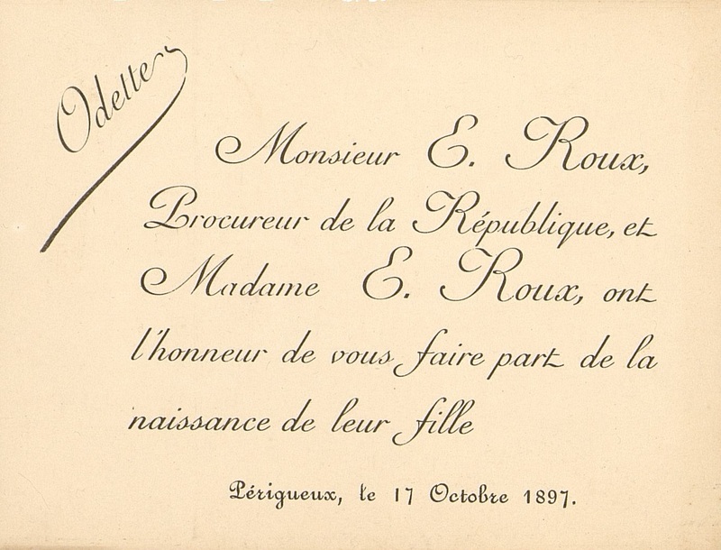 Faire-part de naissance d'Odette Roux à Périgueux.