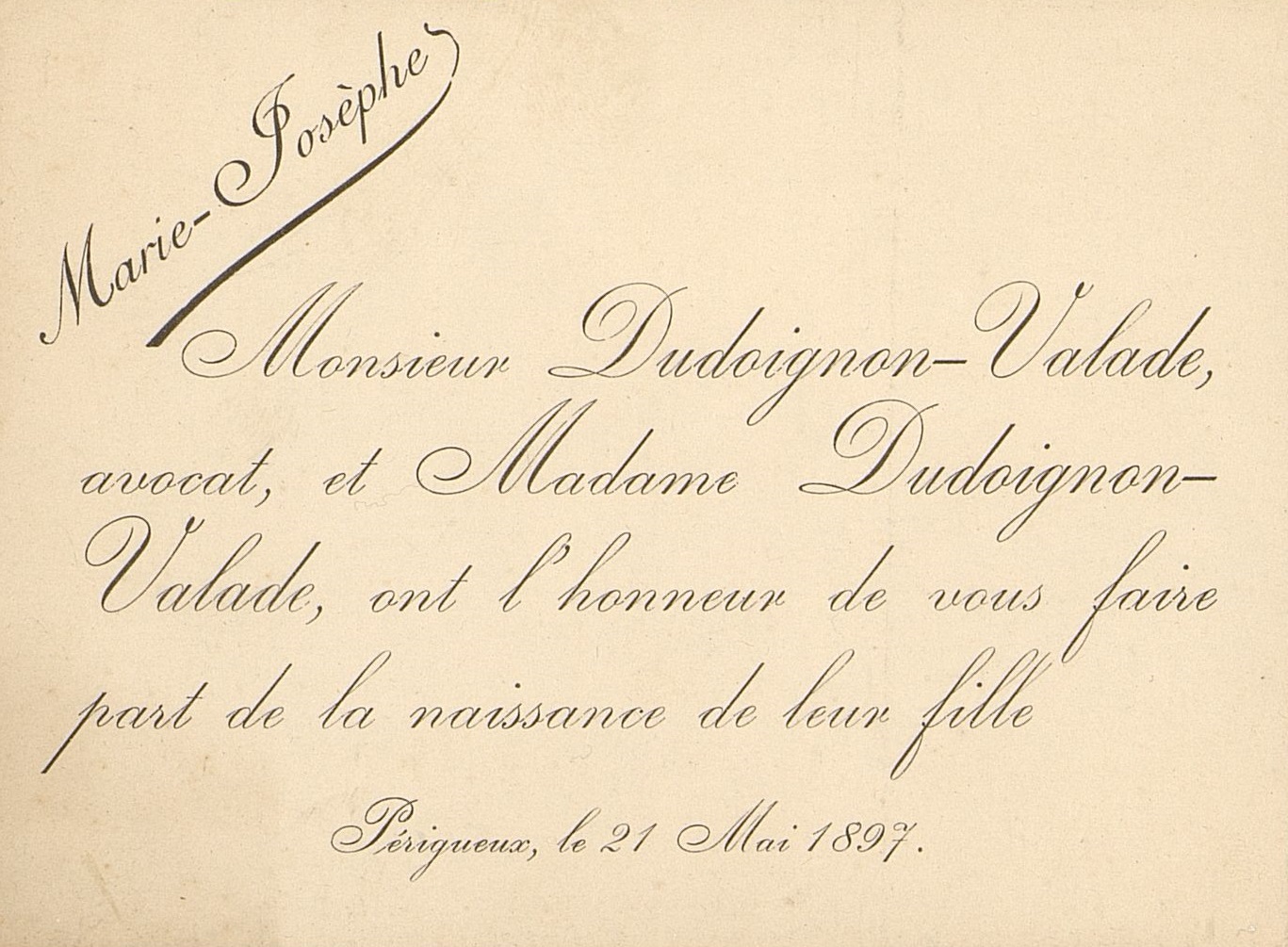 Faire-part de naissance de Marie-Josèphe Dudoignon-Valade à Périgueux.