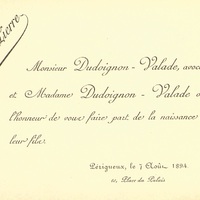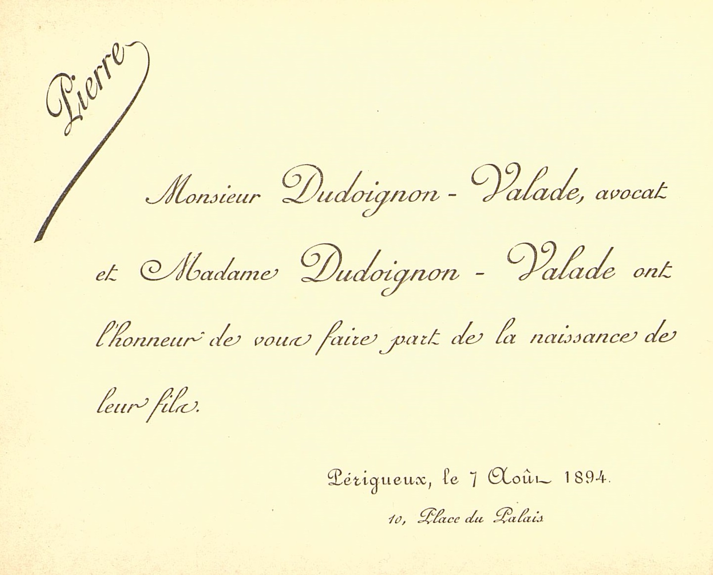 Faire-part de naissance de Pierre Dudoignon-Valade à Périgueux.
