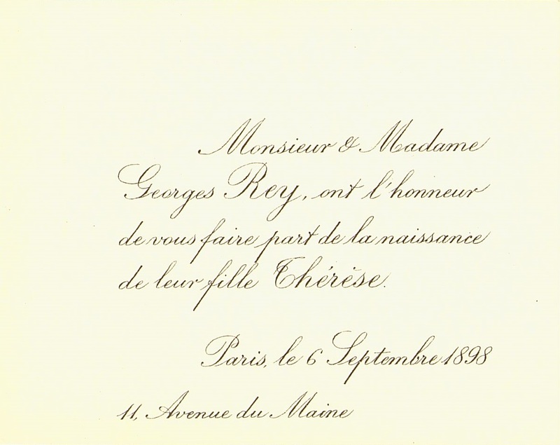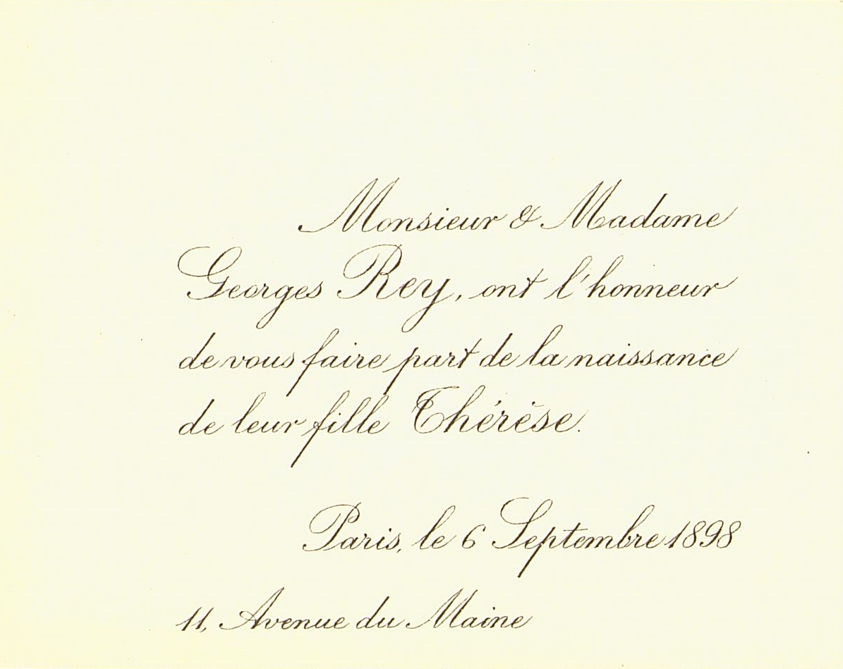 - Faire-part de naissance de la famille Rey pour leur fille Thérèse.