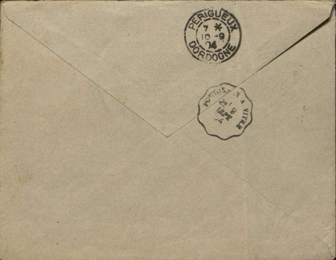Enveloppe d'expédition adressée au correspondant du journal "La Petite Gironde" à Périgueux. Tampons d'oblitération de la gare de Fougères, Ille-et-Vilaine du 4 septembre 1904 et à Périgueux le 10 septembre 1904. Tampon de Vitré le 9 septembre 1904