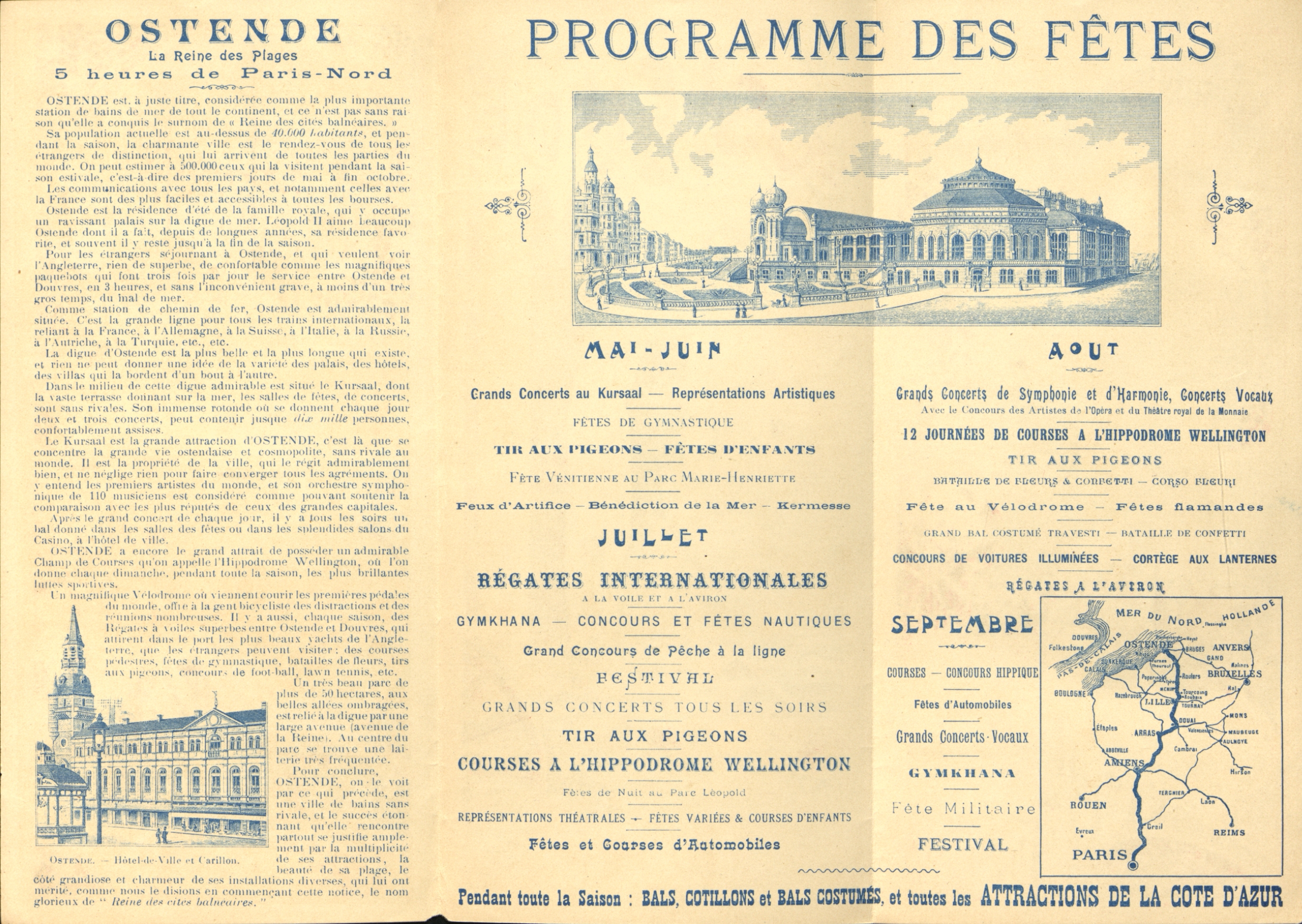 Dépliant publicitaire sur 3 pages avec une présentation de la station balnéaire "Ostende La Reine des plages" et du programme des fêtes s'étalant de mai à septembre. Grands concerts au Kursaal. Régates internationales
