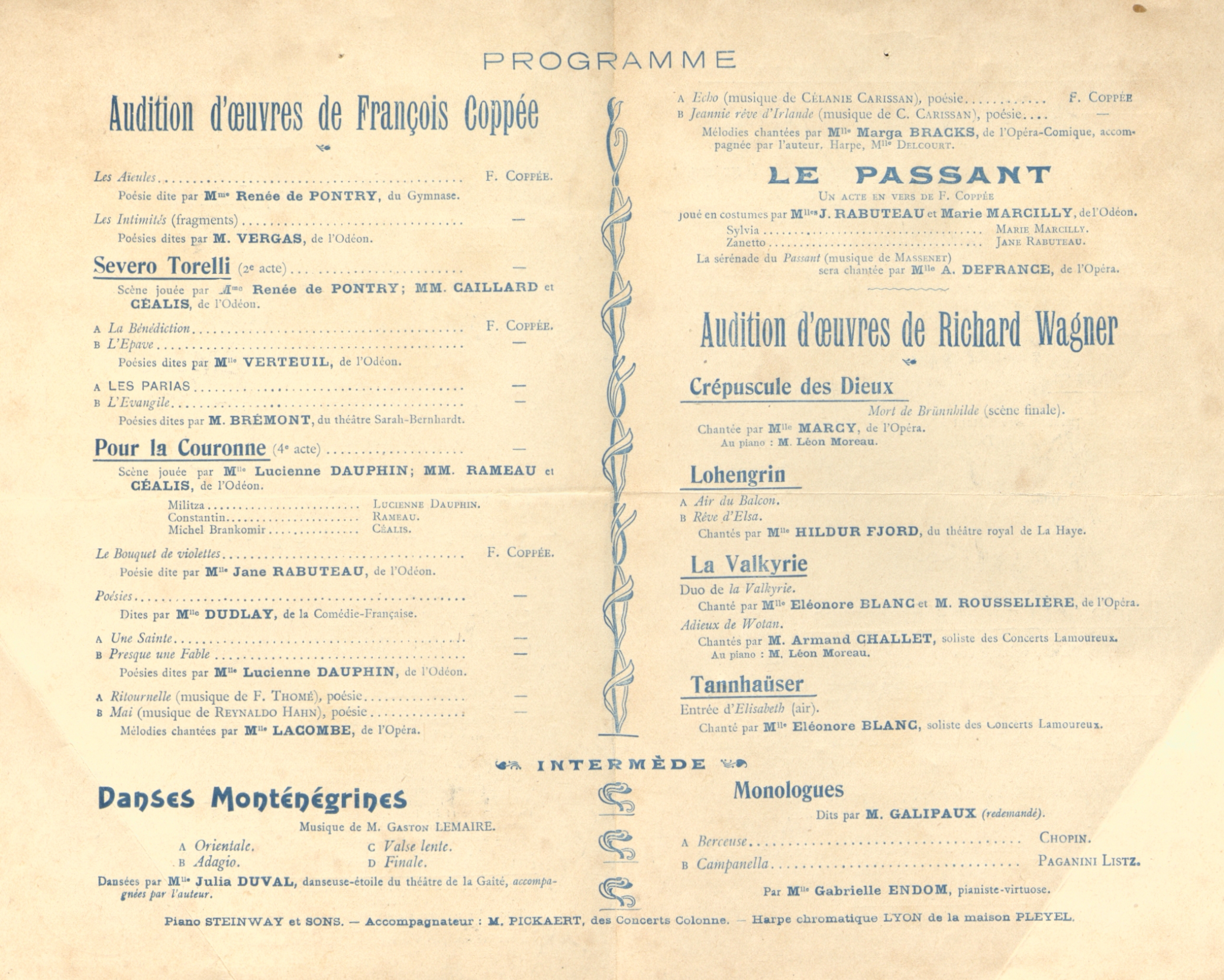 Programme [1ère partie] : Audition d’œuvres de François Coppée : Les Aieules : poésie dite par Mme Renée de Pontry . Les Intimités : fragments : poésies dites par M. Vergas, de l'Odéon. Servo Torelli : 2ème acte. Scène jouée par Mme Rénée de Pontry, MM Caillard et Céralis de l'Odéon. La Bénédiction . L'Epave : poésie dites par Mlle Verteuil de l'Odéon. Les Parias. L'Evangile: poésie dites par M. Brémont du Théâtre Sarah-Bernardt. Pour la Couronne : 4ème acte. Scène jouée par Mlle Lucienne Dauphin, MM Rameau et Céalis de l'Odéon, Lucienne Dauphin (Militza), Rameau (Constantin), Céalis (Michel Brankomir). Le Bouquet de violettes : poésie dite par Mlle Jane Rabuteau de l'Odéon. Poésies dites par Mlle Dudlay de la Comédie Française, Une Sainte. Presque une fable : poésie dite Mlle Lucienne Dauphin de l'Odéon. Ritournelle poésie de François Coppée sur une musique de F. Thomé. "Mai" poésie de François Coppée sur une musique de Reynaldo Hahn, mélodies chantées par Mlle Lacombe de l'Opéra. Écho poésie de François Coppée sur une musique de Célanie Carissan. "Jeannie rêve d'Irlande" poésie de François Copppée sur une musique de C. Carissan, mélodies chantées par Mlle Marga Bracks de l'Opéra-Comique accompagnée par l'auteur et Mlle Delcourt à la harpe. Le passant en un acte en vers de François Coppée joué par Mlles Jane Rabuteau (Zanetto) et Marie Marcilly (Sylvia) de l'Odéon . La Sérénade du Passant musique de Massenet chantée par Mlle A. Defrance de l'Opéra.