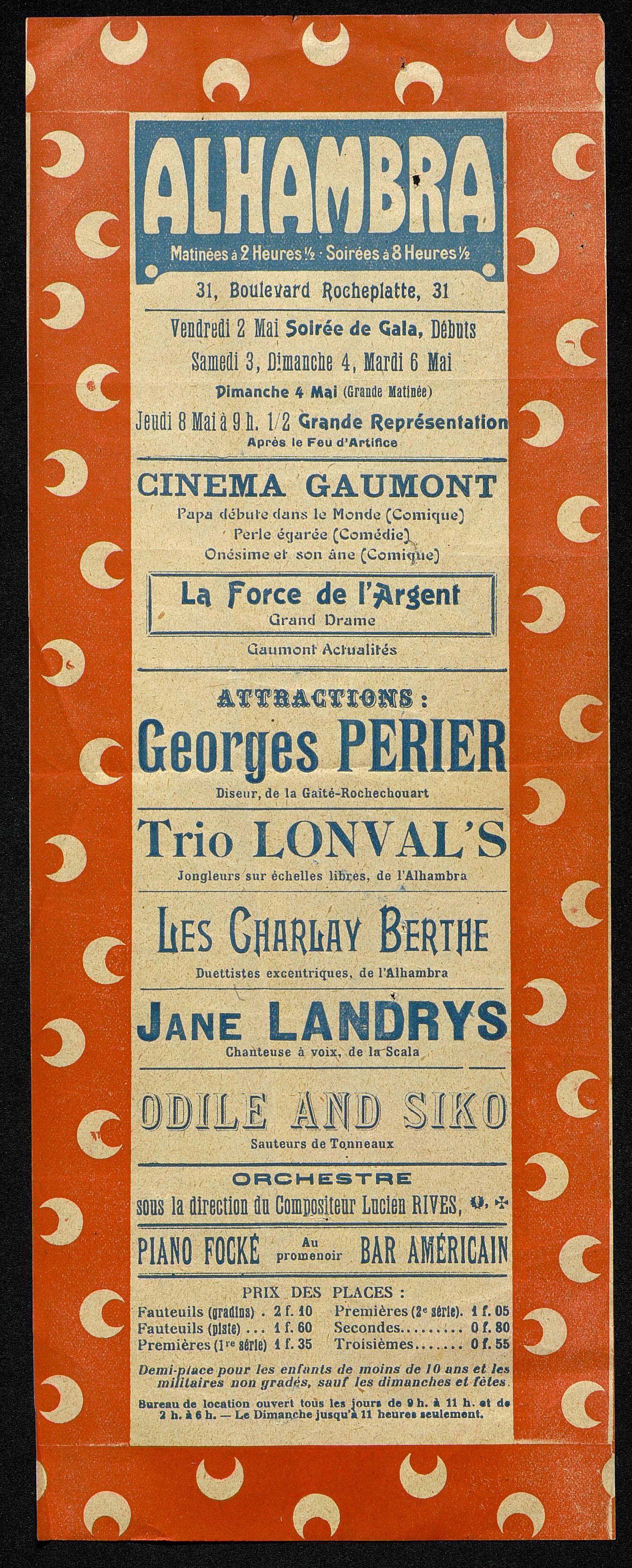 Affichette de l'Alhambra : artistes en représentation, horaires et tarifs.