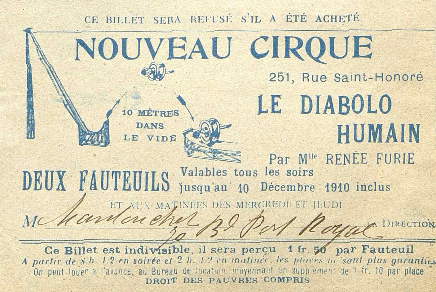 Billet de réservation du Nouveau Cirque pour deux fauteuils offert à M. Mardoucher ou Hardoucher (?) 70 Boulevard de Port-Royal.