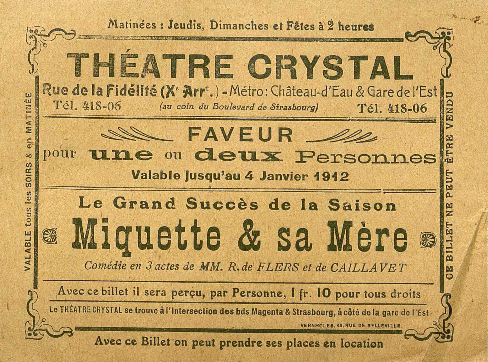 Billet de faveur pour deux personnes pour le Théâtre Crystal. Au programme : Miquette et sa Mère, comédie en 3 actes de MM. R. de Flers et de Caillavet