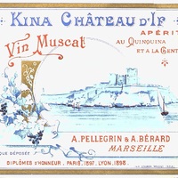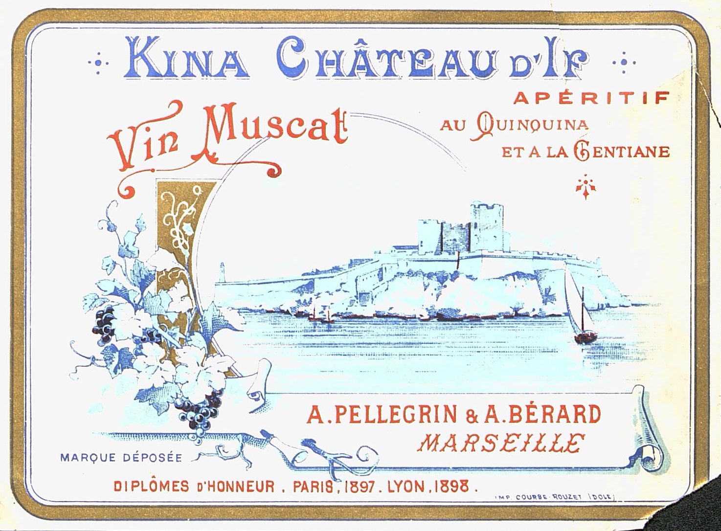 Etiquette d'un apéritif au quinquina et la Gentiane avec un dessin du Château d'if.