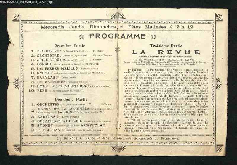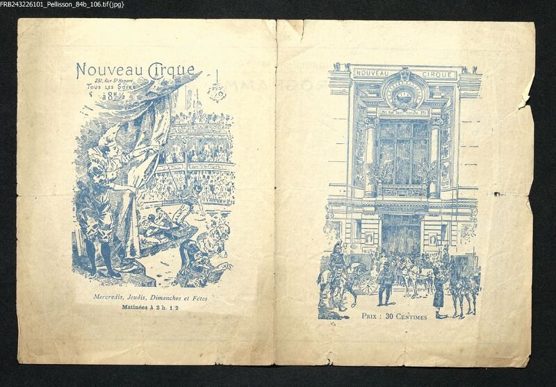 Programme publicitaire du Nouveau Cirque, avec au dos la musique, les attractions et les divers tableaux de cette revue.
