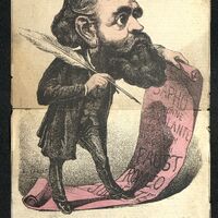 Charles Gounot en caricature, posant une plume à la main et avec la liste de ses œuvres musicales.