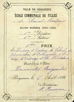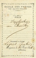 Prix de l'Ecole des Frères de St-Front d'Instruction Religieuse, de Lecture, d'App[lication] à l'Ecriture, de Calcul, de Récitation,d'app[lication]à l'Orthographe, d'app[lication] aux devoirs écrits, d'Assiduité, de Bonne Conduite. Prix 1890