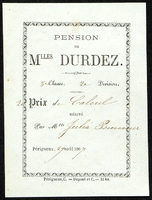 Pension de Mlles Durdez . Prix d'ouvrage manuel et de calcul 1887