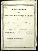 Billet de Prix de Mémoire du Pensionnat de Mesdames Helfenberger et Marty petite classe