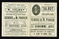 Représentation de Talbot sociétaire de la Comédie française dans "Le gendre de M. Poirier" au Théâtre Municipal de Périgueux le jeudi 20 mars 1902